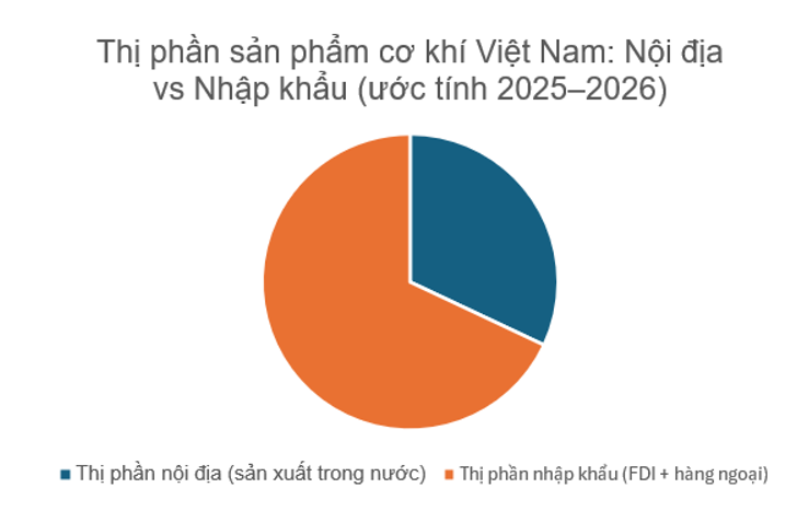 Dưới đây là biểu đồ minh họa thị phần nội địa vs nhập khẩu trong ngành cơ khí Việt Nam giai đoạn 2025–2026, dựa trên dữ liệu từ các nguồn uy tín như Hiệp hội Doanh nghiệp Cơ khí Việt Nam (VAMI), Bộ Công Thương (MoIT), và các báo cáo gần nhất (2024–2025, dự báo ổn định hoặc thay đổi nhẹ sang 2026 do phụ thuộc nhập khẩu vẫn cao).