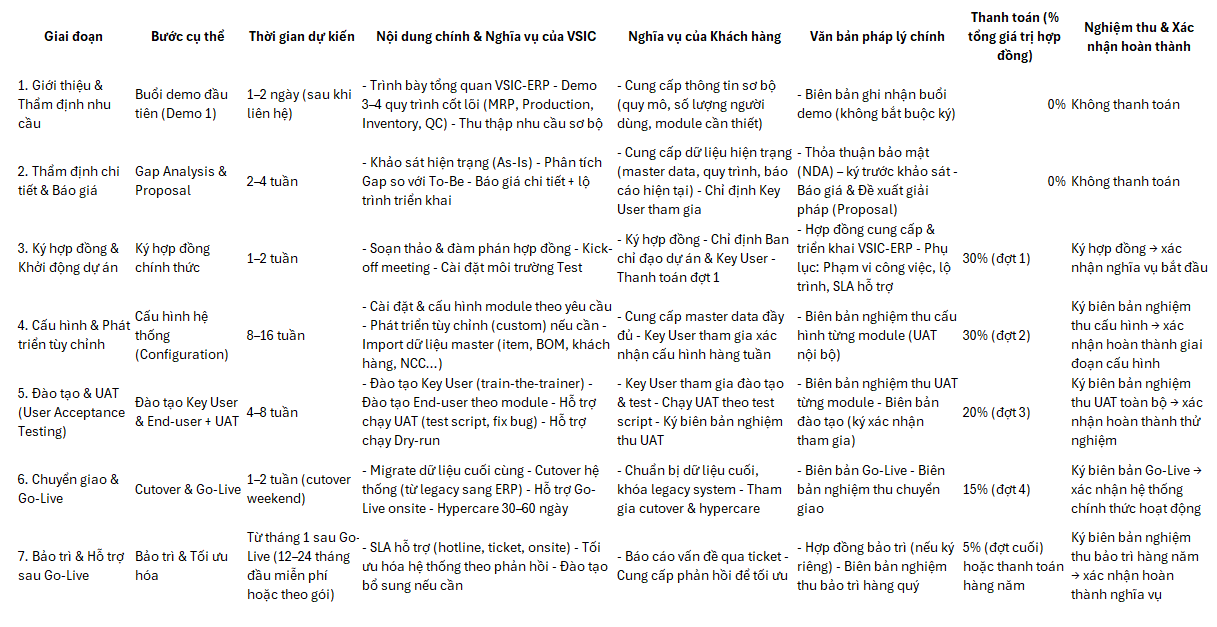 Sau đây là lộ trình cung cấp phần mềm VSIC-ERP chi tiết, được thiết kế dành riêng cho doanh nghiệp sản xuất gia công cơ khí Việt Nam. Lộ trình này đảm bảo tính minh bạch, pháp lý chặt chẽ và thanh toán theo tiến độ hoàn thành nghĩa vụ thực tế.